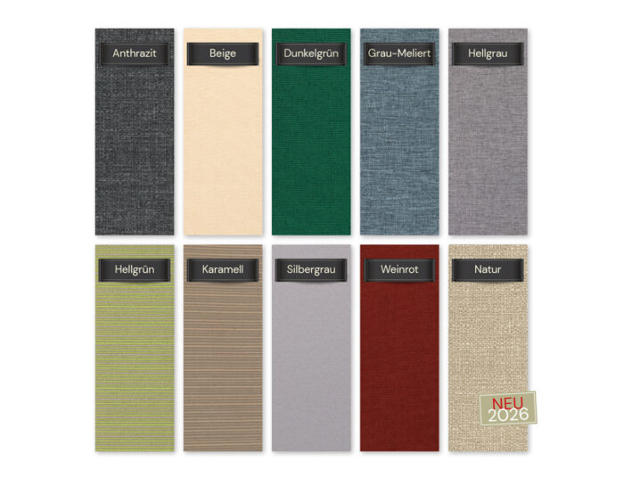 Für unsere Geflechmöbel bieten wir Ihnen Bezüge in Creme, Silbergrau, Weinrot, Sandbraun oder Mint an.