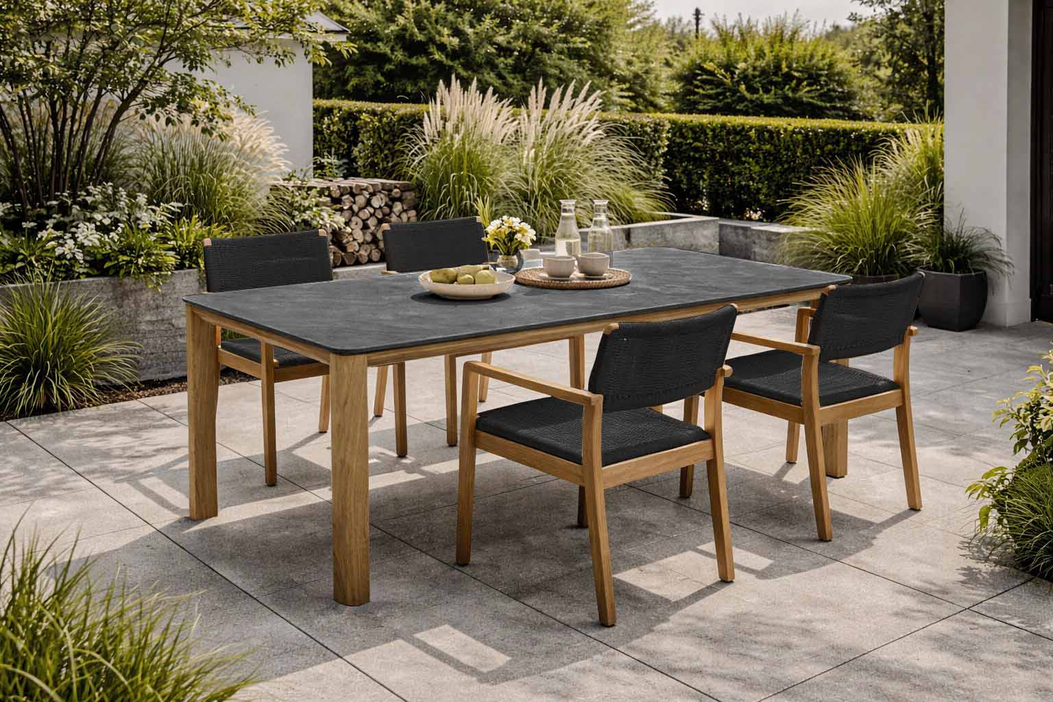 Die Tischbeine formschön abgerundet, die Tischplatte aus hochwertiger Keramik, erhältlich in zwei Farben – so präsentiert sich unser neues Speiseset Trondheim.